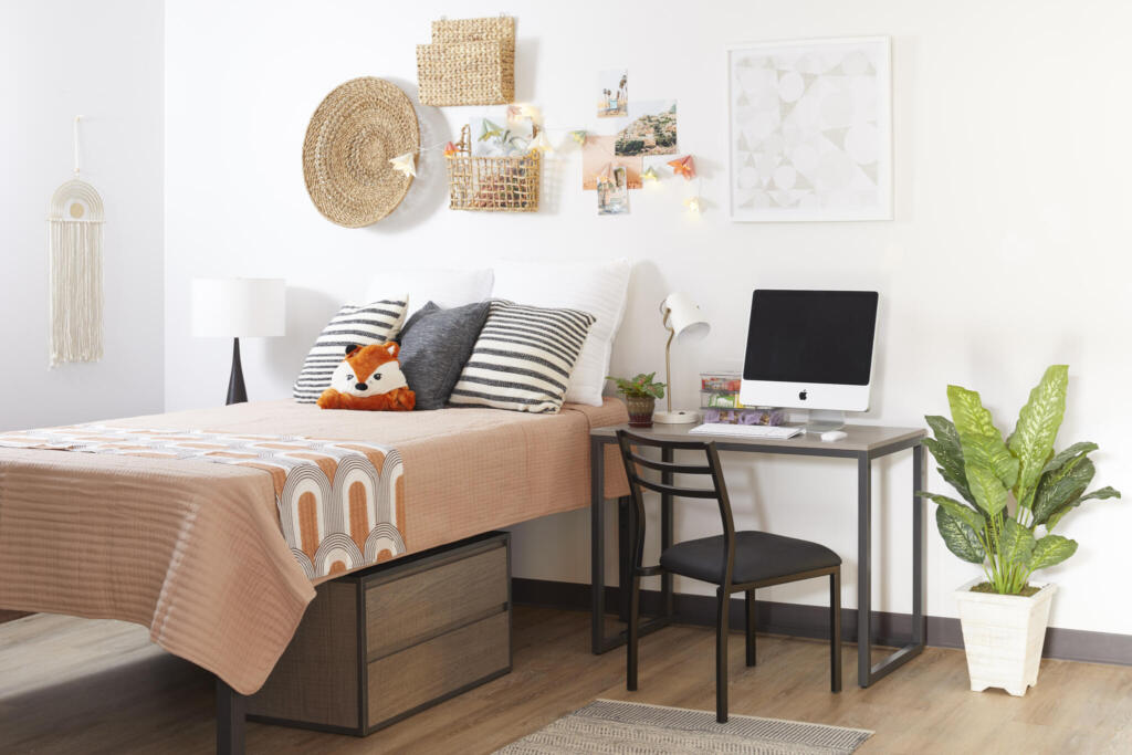 - Dual-Purpose Pieces: Versatile, multipurpose furniture such as convertible desks are great for shifting between tasks (like studying, sleeping, and relaxing). These pieces offer students more functionality without sacrificing valuable square footage.